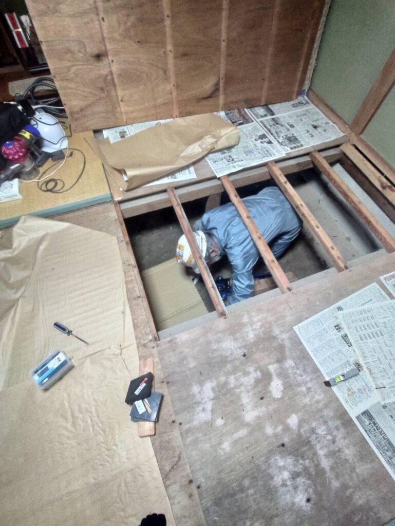 1階全ての床がこの症状なのですが、材料と施工時間の都合で三分の一程度しか完了していません。直した部屋は非常に快適になり、ご依頼者様もとっても喜んでくださいました!。残りの施工個所は次回の活動にスケジュールしたいと考えています。ただ、当団体のみでの資本では既に活動限界レベルです…長野県社会福祉協議会からの助成金は重機ダンプの補助はダメとの事でした。宿泊費は出るそうなのですが、宿代を浮かせて一日でも長く重機ダンプを稼働させようとしましたため本末転倒な状況となりました(汗)。長野県社会福祉協議会から「ボラサポ」を紹介頂いたので、何とかそちらを申請してみるつもりですが、活動資金調達の影響で活動が頓挫する事だけは何としても防ぎたい所です。