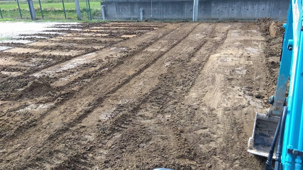 今日は夕方4時までにダンプ5杯分を搬出し運搬は完了!(廃土場所まで往復1時間…遠いのが本当に非効率なのです)。この後は重機オペ泣かせの緩い地面の整地…。バケットで粗く均した後、ツカミで角材を持ってトンボのように慣らして仕上げて行きます。