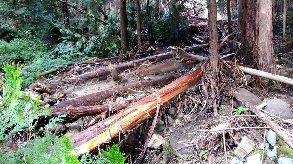 スマホ写真と言うのはサイズ感が解らないですね…下の丸太は幹の太さが150㎝~2Mもあります。長さは20M程…。この林道の先100Mまで歩いて入ってみましたが、手前を取り除くと後ろの土砂と木々が落ちて来そうな気がして怖いです。林業専門家の方と慎重に相談しながら進めています。