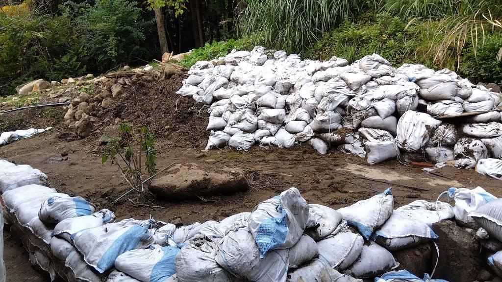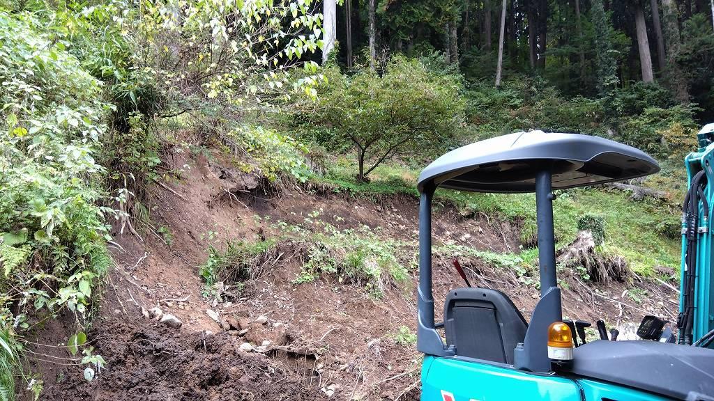 この現場では林道に出来た本来とは異なる水みちを重機で修正。林道内に転がる大きな石を邪魔にならないように移動させ、その後丸太を切断する予定です。更に当団体後方支援活動者を2名×4日投じて敷地に入り込んだ土砂・土嚢袋を取り除く作業も行います。