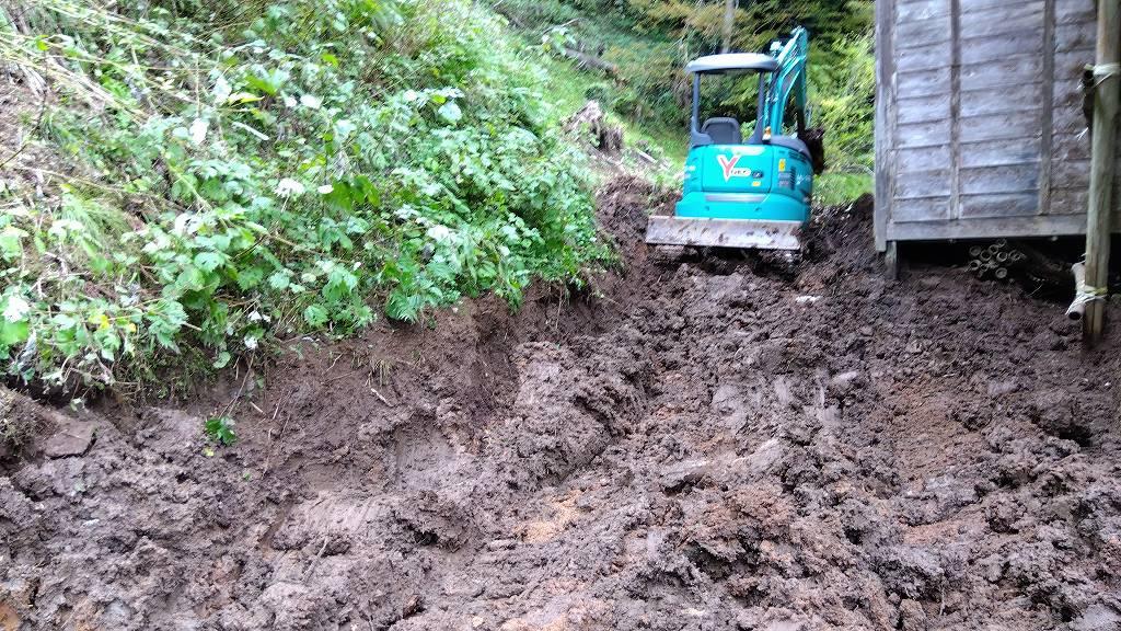 北陸地方の秋は非常に雨が多い場所です。冬は雪も多く晴天の日が本当に少ない地域です。主に土砂や敷地内の瓦礫をを撤去する活動が多い私たちにとって、雨でぬかるんだ場所での活動は例え重機と言っても危険です。特に洪水で地盤も緩んだままですので細心の注意を払って作業を進めなければなりません。