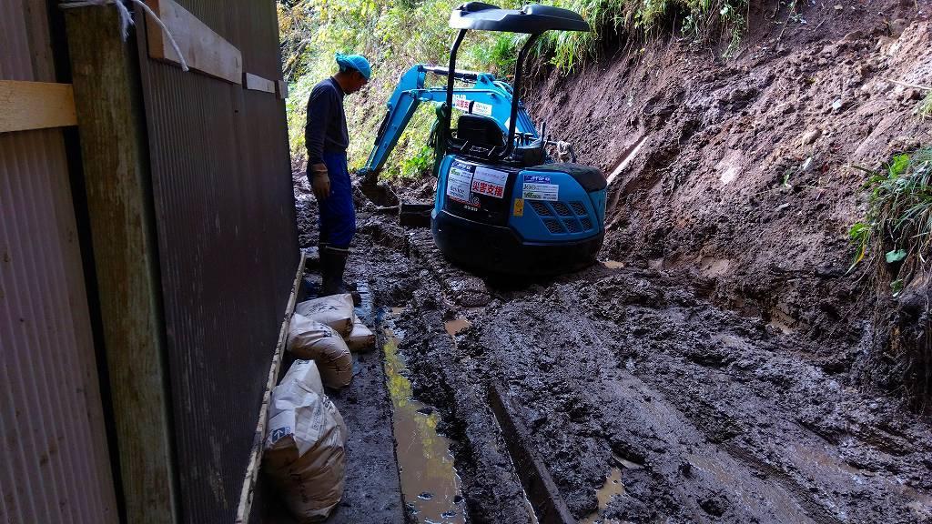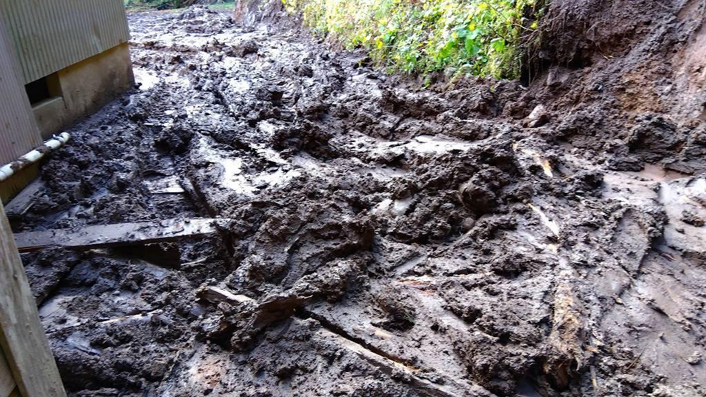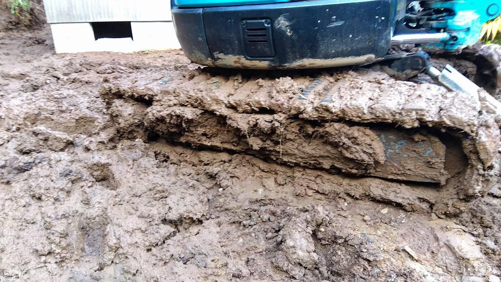 ▲ 写真で見ると大したことがないように見えます。重機のキャタピラの上部まで沈む泥なので進みません。この場所で重機が身動きできなくなり、脱出に1時間使ってしまいました。詳しくは下の日報動画にて。