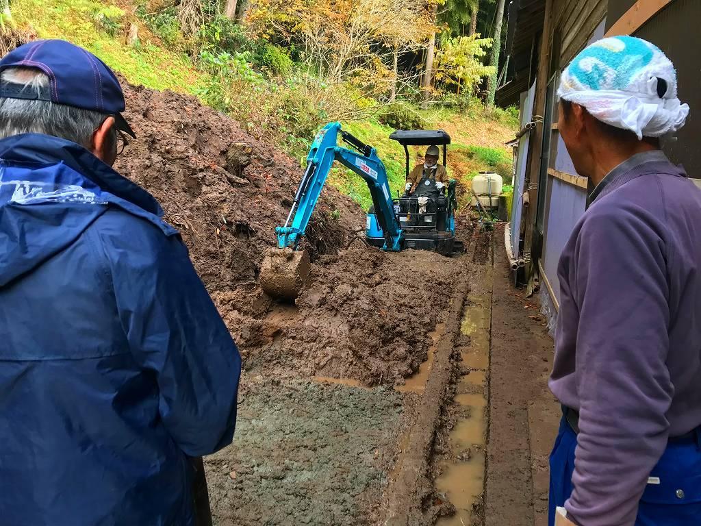 泥現場は動けば動くほど荒れます。施工業者なら間違いなく鉄板を敷きますが、そんな資機材はありません。重機にも非常にリスクのある使い方で心が痛みますが自分にも重機にもムチを入れて作業開始!