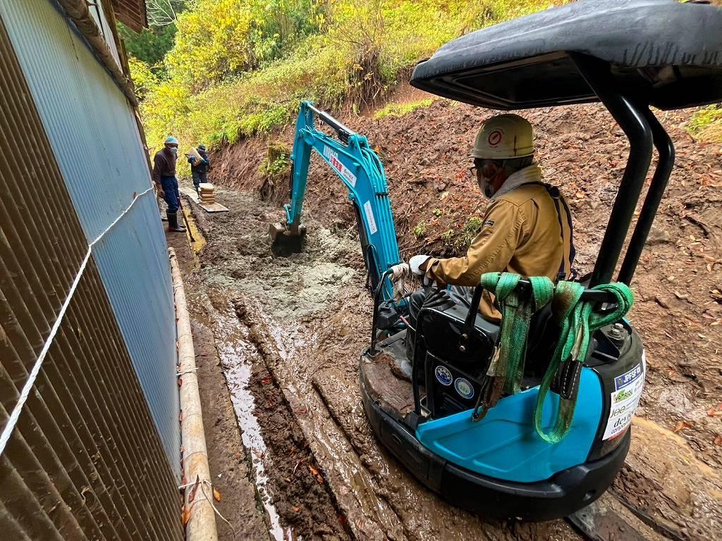 動画内、一部重機の安全推奨運用とは逸脱した使い方をしています(バケットに人を乗せる事は禁止されています)。しかし、限られた資機材の中でこのお宅に土砂が入らないようにするためには必要な手段でしたため、当方の責任において判断し、スタッフの安全確保を最優先した上で運用しております。