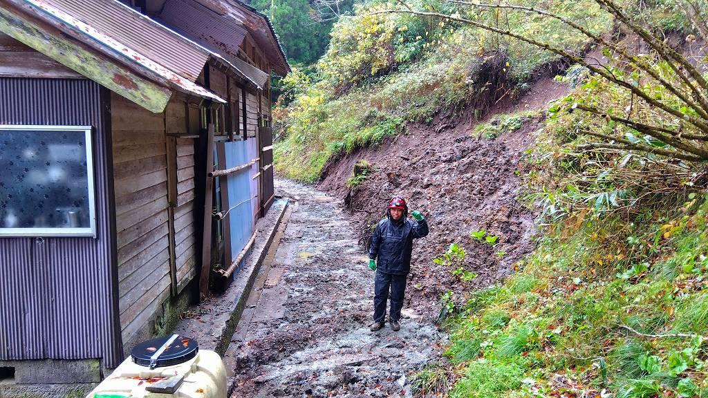 今日は、すっかり長期戦になってしまっている「裏山崩れによる泥被害から住宅を守る作業」の決戦日です。何度くじけそうになった事か…いや、ここ数日は既にくじけていました。今日は支援仲間が結集!昨日に引き続き魚谷さん、上野さん、山田さんが集結。超難関作業の決戦日ですが合計5名で挑むので私は気持ちが非常に良い朝。