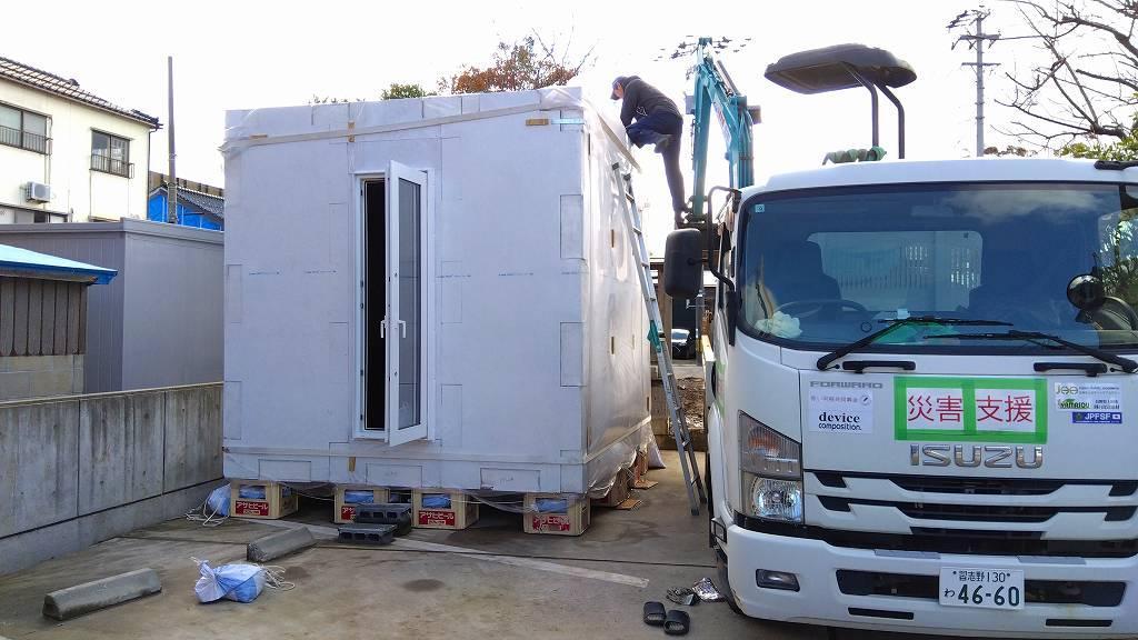 ▼ 山間部案件3か所を見て回った後、市街地に向けて移動…途中でコインランドリーでの珍道中がありましたが、「被災地NGO協働センター」さんの案件をお手伝いさせて頂きました。「移設した簡易ハウス(積み木型)の雨漏りが酷く使えない…」との事で、その屋根にブルーシートを掛ける作業です。